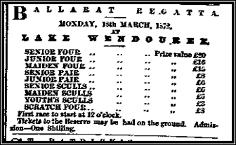 The early 1872 Ballarat Regatta Committee, made up of representatives from both clubs, again organized the Ballarat Regatta to be held on Lake Wendouree again. It was decided to ask the Water Commission permission to enclose part of the reserve near the boathouses to erect a grandstand to improve conditions for spectators. This they duly did. The committee was unable to obtain concessions from the railways for the visiting Geelong and Melbourne crews so it was agreed to meet half the costs of transporting boats to the regatta. This may have had an impact on the numbers competing at the regatta the cost keeping some crews from attending. Also the prize money was considerable as can be seen from the advertisement below. As the average weekly wage was around two pounds, in today’s terms it would be roughly equivalent of $2000 prize money for the Senior four.
