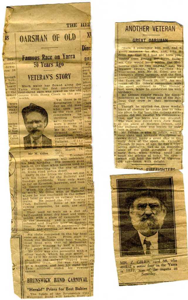 This picture of Zachariah Giles was taken in 1924 with the committee of Ballarat City Rowing Club. He was a guest of the Ballarat Regatta committee. He was the first Ballarat City stroke to achieve Senior status and also the first to represent the club at a national level racing in the first Intercolonial boat race in Melbourne on the Saltwater River in 1873. He represented the club with distinction until 1878 when while working as a guard on the railway in Ballarat, he slipped and was run over by a wagon losing his right leg. It was a tragic end to his rowing career and he was extremely lucky not to lose his life.