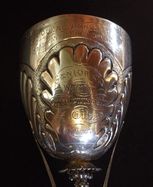 This season the men indeed grasped the nettle and took on Captain Cazaly’s challenge of the year before and did bring home his heart’s desire-a Grand Challenge cup-the very first to be won by a Ballarat crew and brought to Ballarat. The crew of John Stout A. Gibbs, W.Crampton, Fitzgerald and Z.Giles carried off the race for the Grand Challenge Cup for the Senior Gig at Geelong Regatta. In winning the Grand Challenge Cup the crew defeated the highly acclaimed Civil Service crew stroked by the champion oarsman Mr. Carter. The cup was apparently a beautiful specimen designed and manufactured by Mr. Fischer of Moorabool Street Geelong and must have pleased Captain Cazaly greatly. John Stout also won the Maiden sculls at the same regatta.