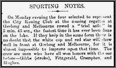 In March the City crew of Gibbs, Fitzgerald, Crampton and Hughes set a record time for the mile on the Lake (The Star, Tuesday, March 1st,1877) Despite training obviously going very well and setting record times, the club did not record any wins at either Geelong or Melbourne 1877. Also interesting to note is that the racing uniform is now a white cap with a red star!