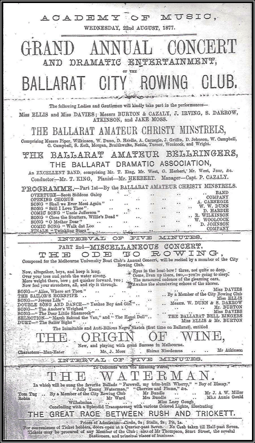 The club held a most innovative and incredible fundraiser this year. A Grand Concert was held in the August to raise funds for the much needed new equipment. The Star reported that 45-50 pounds was raised through ticket sales. In today’s terms that is $4500 to $5000! This was to become an annual event with the first concert being a gala event of amazing and interesting items! Mr. Peter Cazaly, club captain, was also a singer of some renown contributed an item and managed the band. I’m sure he used his connections in the musical world to assist with other performers. The concert was a great success and raised much needed funds for the club as well as contributing to the cultural life of Ballarat.