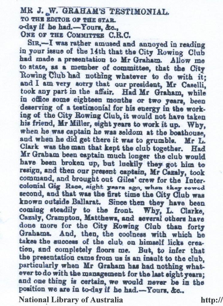 The address was accompanied with a gold watch bearing the following inscription – ‘Presented to Mr. J. W. Graham, founder of the City Rowing Club by members and ex-members, Ballarat 26th May 1879.’