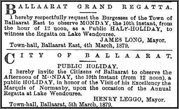 Ballarat Regatta of 1879 marked the beginning of 36 consecutive annual Ballarat regattas until 1915 and the outbreak of World War 1. This sustained run of regattas, uninterrupted by drought or disaster, built the reputation and standing of Ballarat Regatta. As can be seen from the advertisement the regatta was graced by the presence of the Marquis of Normanby. Given the local populace’s interest in anything royal, this was sufficient inducement for subscribers to support a full rowing program plus a yacht race. With good prize money offered, a public half-holiday granted and a royalty in attendance, the regatta was again a great attraction to the public and rowers alike. The prize money was excellent with the Maiden pairs being trophies to the value of 10 pounds; Junior fours-16 pounds; Maiden eights 32 pounds and Senior eights 40 pounds. The wind and the weather on the day were both favourable with the breeze being sufficient for the sailing race but not enough to make it too rough for the rowing. The lake was dotted with steamers, sailing and rowing craft from noon until sundown. The regatta was an unqualified success and some 7000 people flocked to the shores of Lake Wendouree, the greatest attendance at any Ballarat Regatta to date.