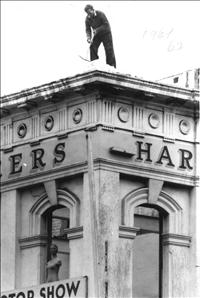 Photograph from the demolotion of the Harry Davies building 1961 with one of the workers standing on the roof. It is possible that it was Peter. Photo from the Ballarat Historical Society archive.