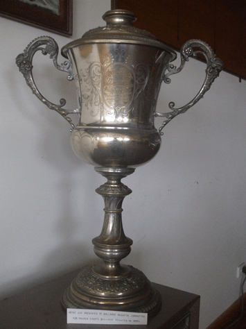 I have included a picture of this trophy just to show the type of cup competed for. This trophy was for the Maiden Eights at Ballarat Regatta. Usually they had to won three times to be retained by the club who scored the 3 successive victories. This trophy, along with several other Ballarat Regatta trophies, is held by Wendouree-Ballarat Rowing Club.