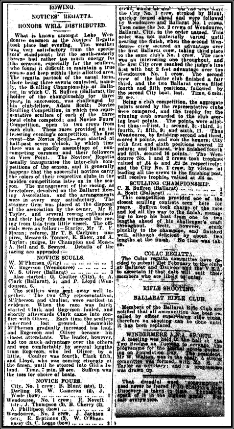 The club made distinct advances in its financial position and in memberships with 22 members being added to the roll.An order for two new boats was put into Mr. Jerram the boat builder of Princes Bridge Melbourne. Mr. Victor also bought a stump, racing sculling boat out of his own funds and the club agreed to buy it for the club when funds became available. At the Ballarat Novice Regatta the club again won the points trophy placing first and fifth in the novice fours. W. McPherson also won the Novice sculls. A report of this regatta is reprinted on page 124.