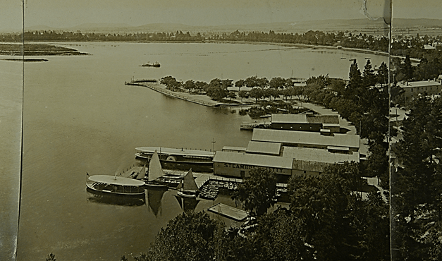 In the photo you can clearly see View Point and a little island called Gill’s Island that was later removed during the 1916 drought. You can also see at the top of the photo the thin black line that is the remains of the embankment that ran from McArthur Street across to the Botanical Gardens. The finish of the original rowing course was between Gill’s Island and View Point.