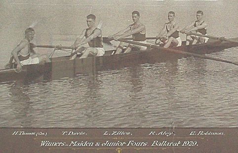 For the first time in the history of Victorian rowing a challenge was made this year to the crew selected to compete in the King’s Cup. The Ballarat Rowing Association had maintained for many years that crews should have the right to challenge the selected crew. To that end a composite Ballarat eight were the first (and I think also the last) to be afforded this opportunity. So the boys from the “rush beds” betook themselves to Melbourne and on the 13th of April 1929, a test race was rowed on the Yarra between the selected crew and the Ballarat boys. It resulted in an easy victory to Ballarat and with it came the right to represent Victoria in the King’s Cup in Perth, Western Australia. The crew were coxed by Mr. A. J. (Ace) Wilson of the club while Mr. J. Beattie and Mr. Lou Zilles were members of the crew with Mr.V.Thomas the emergency. One can only imagine the trip by train, to Perth in 1929.The Victorian eight came third with NSW winning and WA second. Thus Messrs. Beattie, Wilson and Zilles went down in history as the club’s first interstate representatives. Mr. Giles, who raced in the Intercolonial four of 1874, was the first oarsman to represent Victoria but, as he did so prior to Federation, he represented the Colony rather than the State.