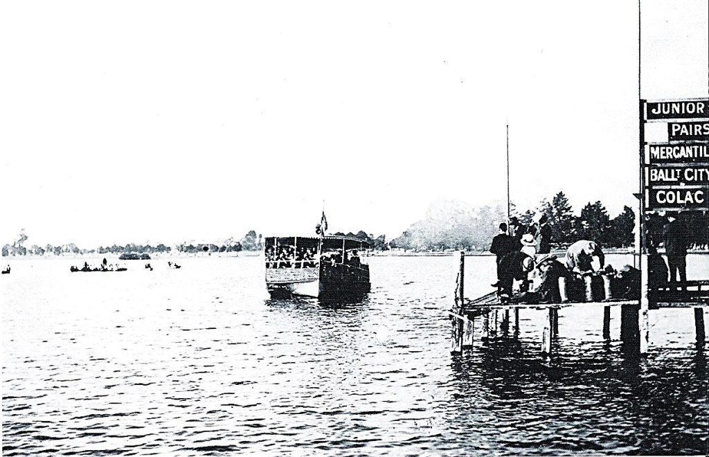 This photo shows the communication system used at Ballarat Regatta in the 1920’s.As can be seen the race is the Junior Pairs with Mercantile first, Ballarat City, second and Colac, third. Mr.Carter Humphries used semaphore to communicate results back to the start and results would be put up on Gill’s jetty. Races were started by shotgun right up until the 1950’s so the crowd would have heard the start of each race as the shot echo across the Lake. Also in the photo is the Golden City paddle steamer which was hired to take the regatta officials out to the course. It would sit about half way down the mile course. On the left of the photo is Gill’s island, Golden City in the middle and Gill’s jetty with results displayed, on the right.