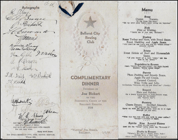 The Social Committee under the leadership of the genial Mr.Bickart continued their efforts on behalf of the club. He again tendered a dinner for the successful crews at the 1934 Ballarat Regatta. The dinner was held at the Wattle Tearooms and we have the menu and program that belonged to Otto Hauser. On the back of the program are signatures of many of the successful oarsmen of that era. The Ladies Committee was formed this year and was presided over by Mrs. Norman Wood. They raised over 70 pounds for the club.