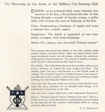 During this season the committee called for designs for a club badge to be used on the club’s blazer pockets. The design submitted by Mr.Gordon Whitworth was selected and the Ballarat City coat of arms and motto ‘Primum Semper’ (Always to the fore.) were adopted unanimously. It has been the badge of the club since with the crest appearing on stationery, clothing and badges. Our racing emblem continued to be the star. Apart from the adoption of the new crest,the season was fairly unspectacular. The club made steady progress in all areas of operation except finances. There, we made astounding progress! Remembering that the whole community was still in the grip of the Depression,it was amazing that through the untiring efforts of the Social committee and the Ladies’ Committee the club not only paid off all its debts but also finished the year with a credit balance of 102 pounds. This was significantly more that any other season and was again a tribute to the hardworking Social committee and the astuteness of the treasurer,Ted Edwards.