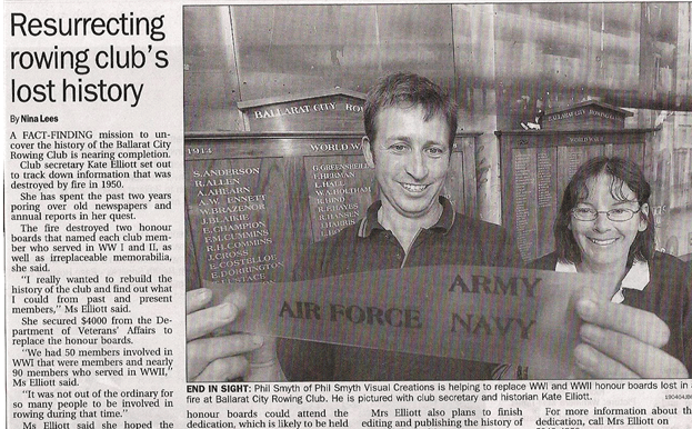 Ninety members of the Ballarat City Rowing Club enlisted for World War 2 and of those 8 men were killed serving their country. Once again war had decimated the ranks of the rowing club and it would take many years to recover. The club lost its original Honour boards in the boatshed fire of 1950. It would take until 2004, as part of my history research and with a grant I obtained from the Department of Veteran Affairs, to replace them. The new Honour boards were dedicated at a ceremony on the 8th of May, 2004, 54 years after they were destroyed. I am proud to have restored this important part of the club’s history and that the names of all who served in both World Wars are now known to all members of the club.