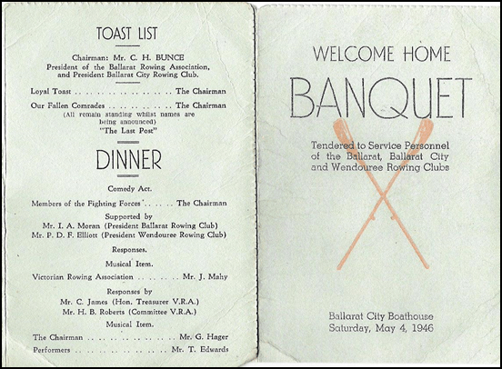 The war ended in September 1945 and by early 1946 and around the country, sport was again being played, as the young and not so young men returned from active service. A Welcome Home Banquet was tendered by the three clubs hosted at the Ballarat City Rowing Club boatshed on 4th of May 1946. Mr. Bunce who had been caretaker President and kept the club running through the war and was President of the Ballarat Rowing Association as well, was chairman for the evening.