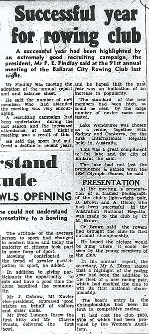 The third National Championships were held on Lake Wendouree in late April. The club were represented by a lightweight pair of Alan Dixon and Daryl Brown. They were competing against the best in Australia and made history by becoming the very first Australian title-holders produced by the club in 96 years. They won the race by an astonishing 6 lengths. Also interesting to note is that the Albert Park crew who came fourth in the pairs race was coached by none other than Pat Harrison! The club also had an entry in the Champion Lightweight four event and they placed second to Haberfield in the first and final of the Lightweight coxless fours. Alan and Daryl teamed with Terry Austin and Mike Rowan to come second by 1 ½ lengths to the more experienced NSW crew. the coach for the crew was Frank Findlay, club President, but this was more of an honorary title. Alan Dixon said that in the pair, they coached themselves as he had been rowing for more than ten years and knew what they had to do. At this stage there was no such thing as motorboats for coaching so you could only see a crew at the start and finish of the course anyway! It was fitting however that they did put Frank down as coach because he will be forever recorded as coach of a winning crew at the Australian Championships. The trophy for winning was a lovely silver cup. Alan Dixon’s family have both his cup and Daryl Brown’s cup. I think the cox got a small version or a medallion.