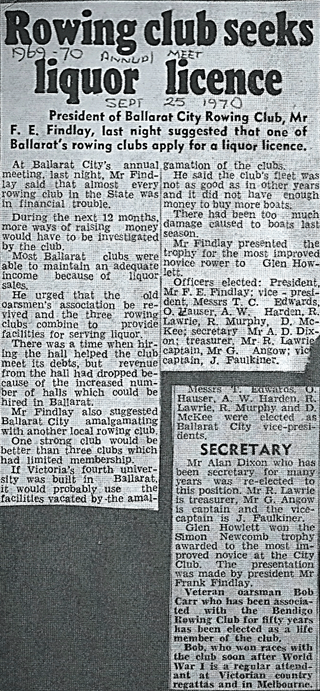 Secretary Alan Dixon closed his report with “The coming year is possibly the most important in the club since we commenced in 1870, as we will be 100 years old, which is something to be very proud of. We are proposing to hold various functions to suitably mark the occasion and trust that every member will give the preparation for these events their fullest support and make this historic season rowing and socially the most enjoyable in the club’s long history. The Centenary Celebrations will be covered in the next post as activities covered the 1970-1971 season.