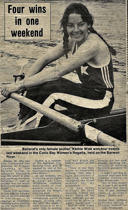 A Special meeting of the club was held on September 19th to officially amalgamate the men’s and ladies’ clubs. They had in reality been operating as one club for several years and the constitution was now changed to reflect that. It opened the way for women to hold positions on the committee and the executive. The only office that a female was not to hold was that of president. The last captain of Begonia City Ladies was Kate Wise with Marg Elliott as vice-captain and Andrea Kriz, the secretary. These three also became the first three female members of Ballarat City and the first women to be appointed to the committee. Kate Wise was elected assistant secretary. At the annual meeting the following trophies were presented by the committee, the Simon Newcombe trophy for the Most Improved Novice-Jenny Hyatt. The Most Successful Oarsman-Danny Elliott and the Clubman of the year-Kate Wise. Our subscriptions were set at $15 for Seniors and $7.50 for Juniors.