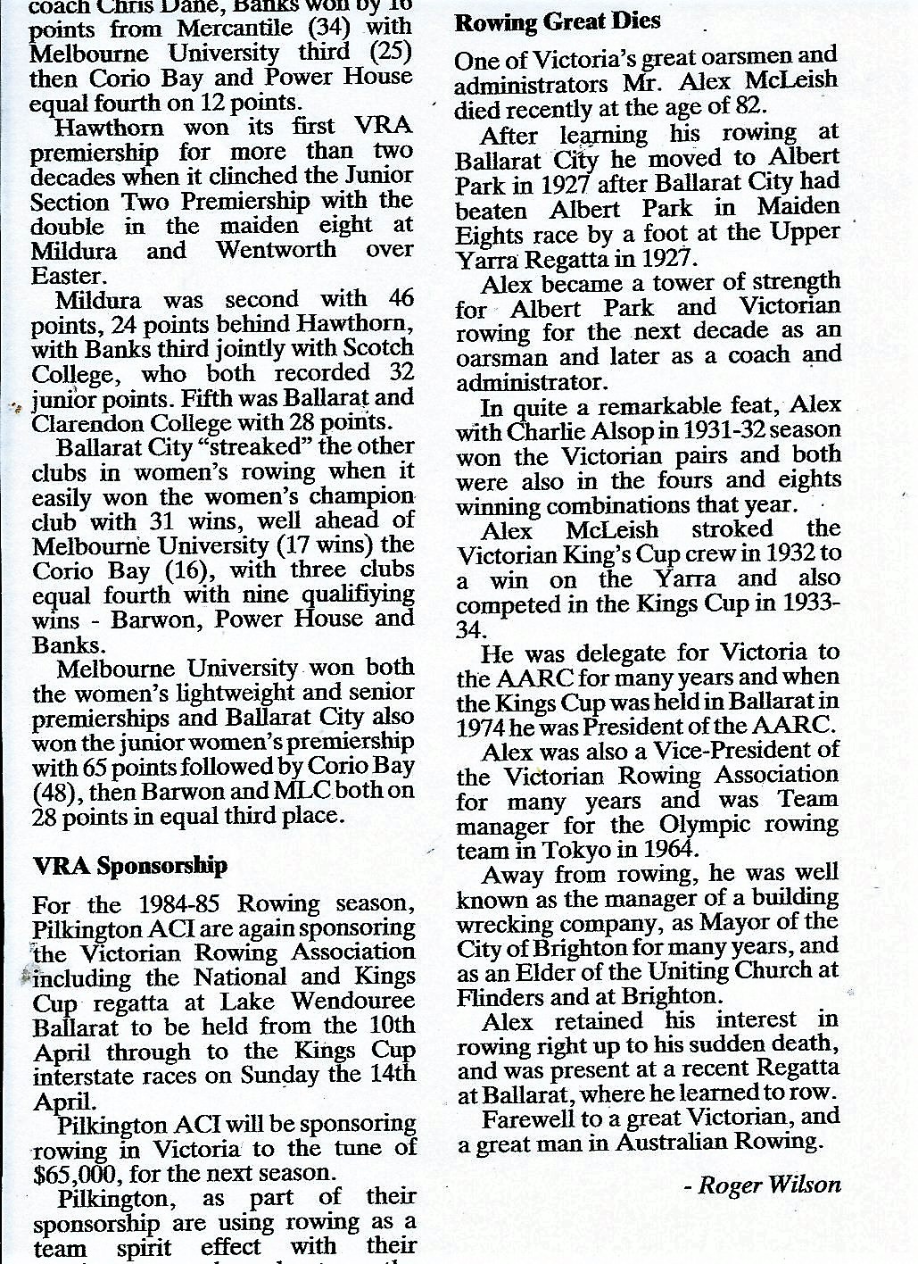 1.Article Australian Rowing June 84. Women’s Premierships and Alex McLeish-Roger Wilson 2. Di Whittle-Senior B scull 3. Carey Robinson, Lori Mitchell, Sonia Adrians, Alison McKee-Senior B four Championship Regatta, February Lake Wendouree