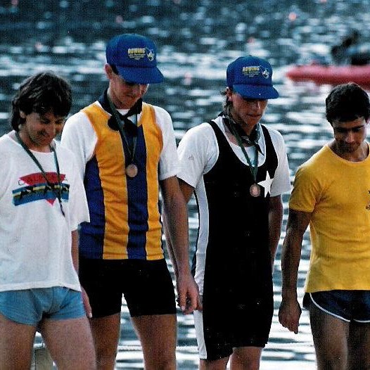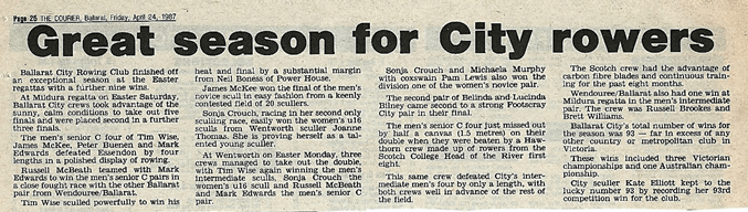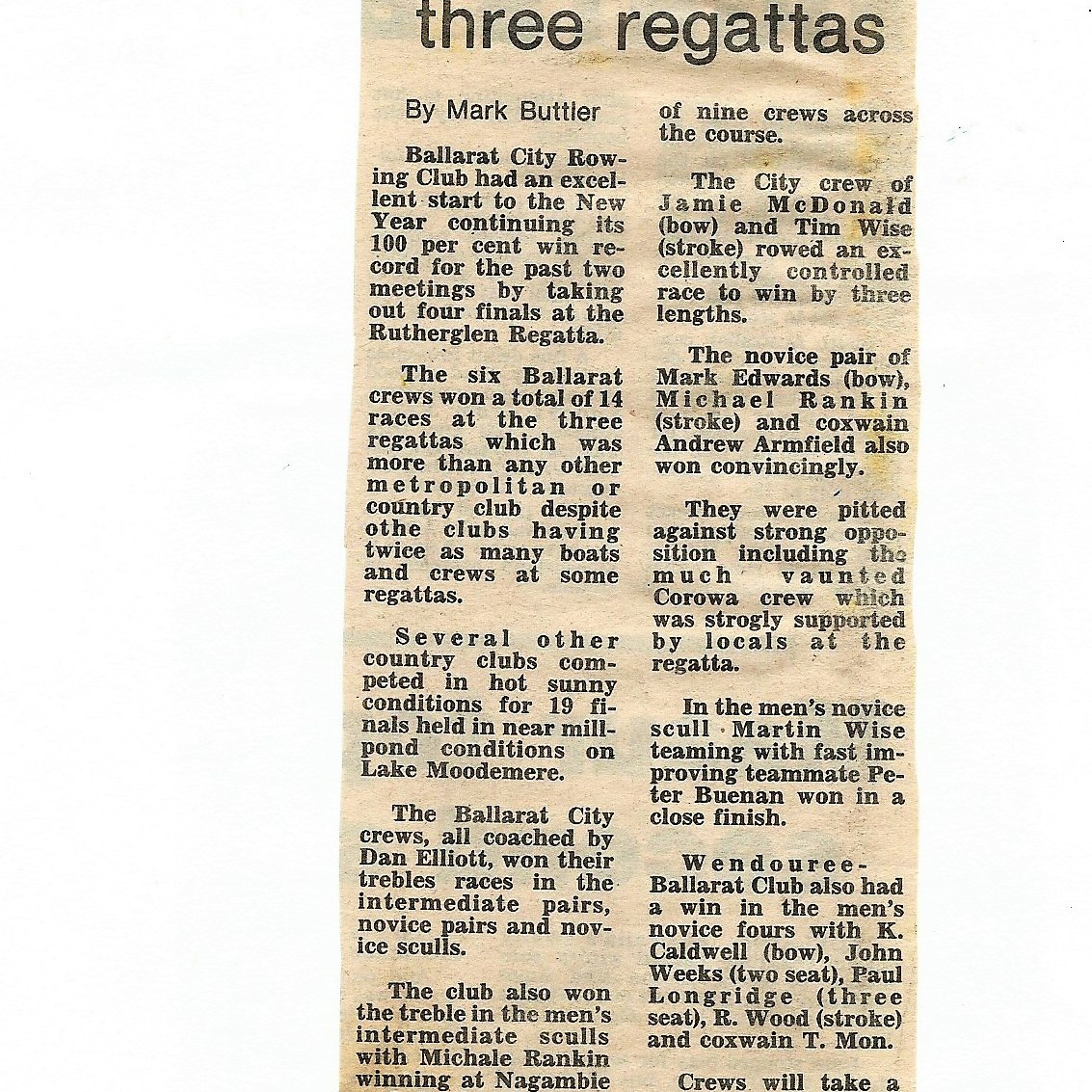 The Treble Treble Boys. Christmas Regattas ,1986-1987 season. At the Christmas Regattas Nagambie, Rutherglen and Yarrawonga the club scored a treble treble, winning intermediate pairs, novice pairs and novice sculls at each of the three regattas. The club entered and won 14 races for the three regattas- an outstanding feat that hadn’t been done before and will probably never be repeated. Left to right:Danny Elliott,Michael Rankin, Jamie McDonald, Tim Wise, Peter Buenen, Martin Wise, Mark Edwards.