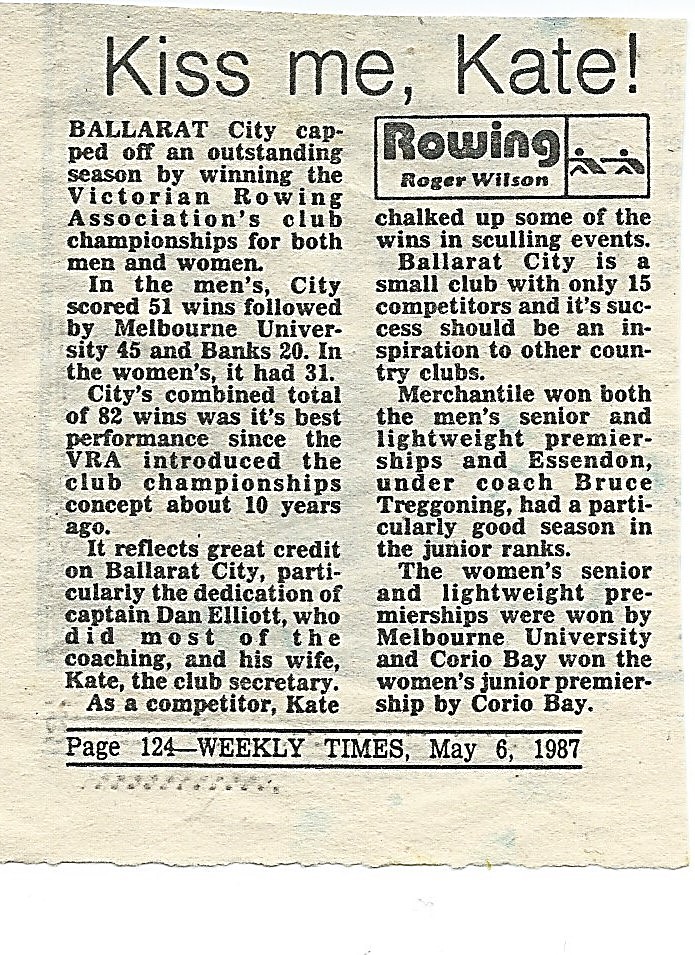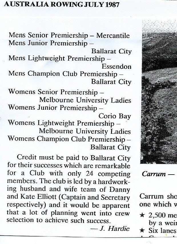 Ballarat City Rowing Club was the Champion Club of Victoria this season. There had been a gradual build up of wins per year and the group of dedicated (some might have said fanatical) rowers guided by coach Danny Elliott, achieved the goal that we had dreamed of for over ten years. It was a year without equal in our one hundred and sixteen year history. Our 94 wins were sufficient to win the Men’s Champion Club and Men’s Junior Premierships and our fourth Champion Women’s Club of Victoria as well as second place on the Women’s Junior Premiership. The club may have been small in numbers but the club was a force to be reckoned with. Jim Hardie, Vice-President of the VRA, commented in the Australian Rowing magazine “Credit must be paid for Ballarat City’s successes which are remarkable for a club of only 24 competing members.” He also mentioned it must have been due to careful planning. It wasn’t! We just worked with what we had and, as everyone sculled and had been coached to be technically proficient in the scull, we could combine crews easily. Much more difficult was making sure everyone won their quota of races at each level-that did take some planning!