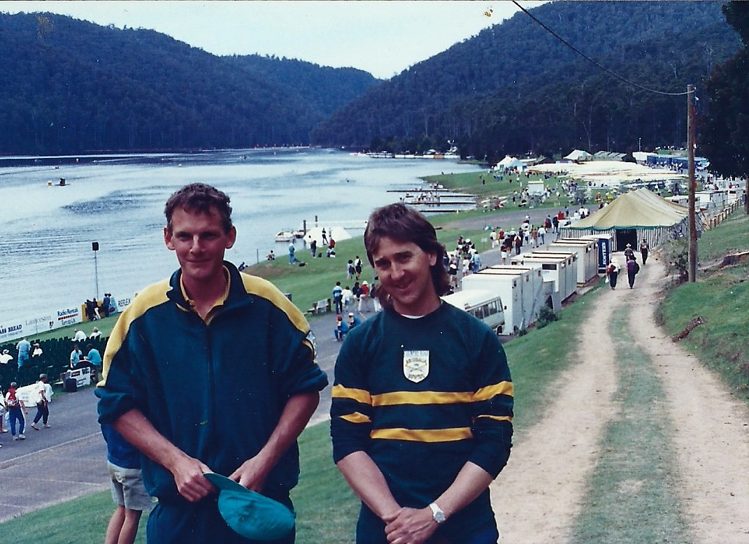 The 1990 World Championships at Lake Barrington, Tasmania were undoubtedly the most exciting event in the history of Australian rowing. For the first time ever, Australian crews were competing with the world on our home course and Lake Barrington did not disappoint. Not only did Australia play host to world rowing but Ballarat City Rowing Club had a member on the Australian team. For the first time Tim Wise through sheer hard work and steely determination, gained his place on the team as the lightweight sculler. Not only was he the first Ballarat City member to be selected to row at the World Championships but he was and is the only Ballarat based sculler to represent Australia in the single scull. The other two scullers from Ballarat, Gary Gullock and Anthony Edwards, both represented Australia but relocated from Ballarat and rowed doubles and quads. It was really an extraordinary achievement to stay in Ballarat, to train on his own through the depths of a Ballarat winter having not been selected initially despite some outstanding performances, then to dig deep mentally and physically to gain selection against the odds is something special. Oh and he was also working full time and there was no AIS or VIS funding to help him out. He did it pretty much on his own even having to raise funds to pay the team fees. Danny Elliott was on the team as his coach and there was just so much excitement when their Australian gear arrived. In just six years from when we set our goals of winning races, winning Victorian Championships and Australian Championships and attaining World Championship level to represent Australia we could also tick that goal.