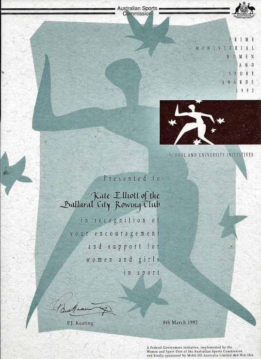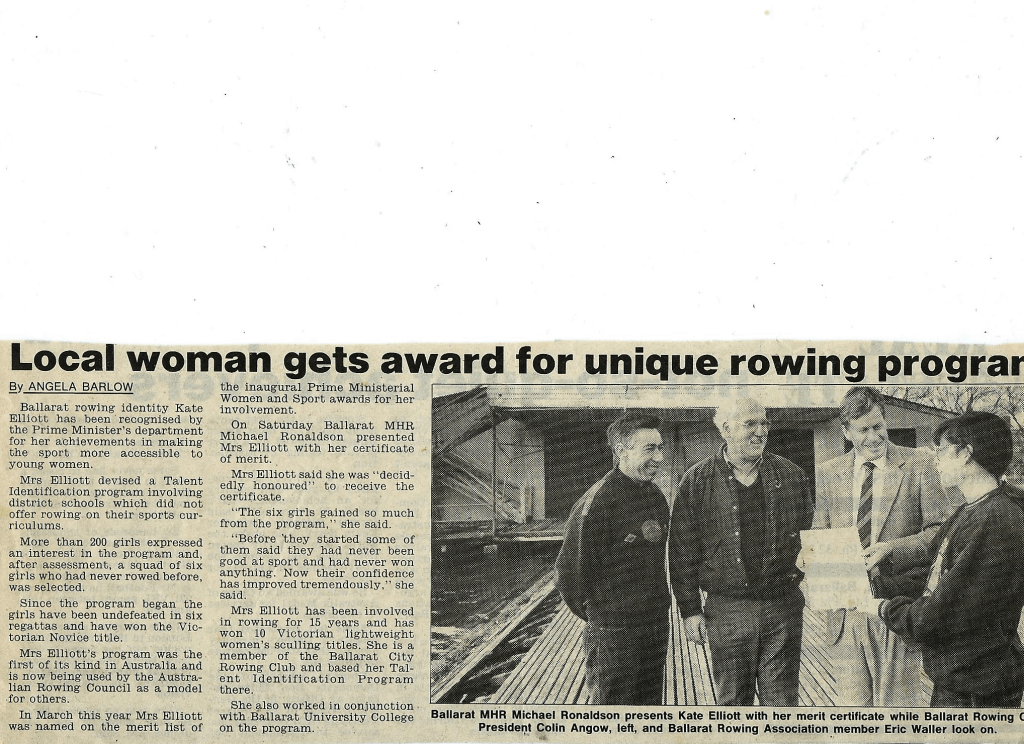 Ballarat City continued to forge ahead hosting Australia’s only regional Talent Identification Program. On a meagre budget (compared to programs in other states) but with extreme dedication and enthusiasm the program exceeded all expectations in its first year. The 14 recruits went from total non -rowers to seasoned competitors in ten months. Four participants left the program through this time but the ten that continued and began contributing to the club. It was considered important from the outset not to repeat the mistake of the Canberra pilot program where lack of integration with the host club was seen as one of the greatest downfalls. Our TIPS (as they were affectionately known) contributed greatly to our on water success and continued the Ballarat City tradition and their parents, by and large, also “joined” the club and assisted with everything from getting TIP’s to regattas to helping with fundraising. In the evaluation completed by squad members and parents after the first 10 months, the program was more successful than they expected and all that continued on did so because they enjoyed their participation in rowing and the club. Secretary and coach for the TI Program, Kate Elliott, was recognized for her work in promoting rowing to women and girls and received an award in the Prime Ministerial Women and Sport Awards in 1992.