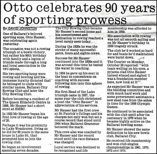 Amazingly Ballarat City posted another incredible season winning 70 races, including 5 Victorian Championships and 1 Australian Championship. With just eight men competing the club finished second on the men’s Champion Club Premiership with Corio Bay Rowing Club the premiers. We also placed third on the men’s Senior Premiership winning more Senior races this season than ever before in the history of the club. Sadly one of the legends of the club passed away this year. Otto Hauser who had contributed to the club as rower, coach, Captain, Vice-President, committee member and Life Member had indeed devoted his life to the club died. From the day he joined until the day he retired he did everything for the club. He was one of the key members who held the club together through World War 2 and was instrumental in the rebuild after the 1950 fire. He epitomized what it means to be a Ballarat City member.