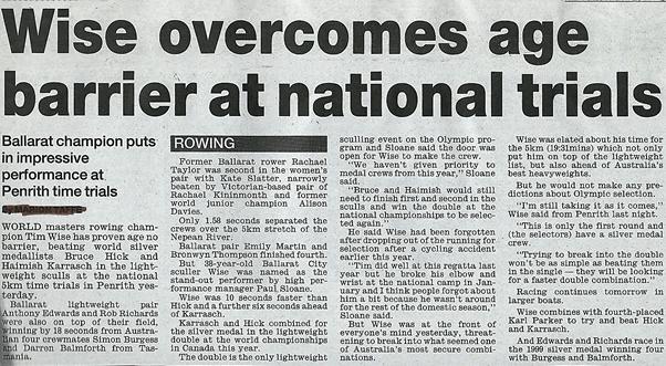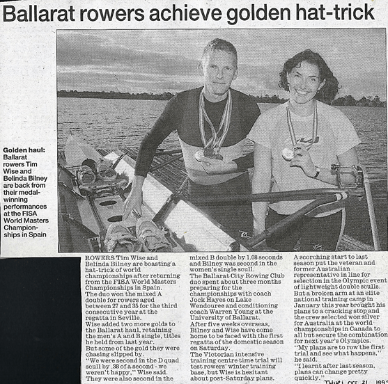 At the Australian Masters National Championships in Canberra, Belinda Bilney competed in the single scull for the first time in the A grade sculls and won a silver medal. Tim Wise just seemed to keep getting faster and he won an amazing 6 gold medals, winning every event he entered. He won the Men’s A scull, B Scull, A and B double scull with Murray Doust of Manning River, Men’s A quad in a composite crew and of course the mixed double with Belinda Bilney. This is made all the more remarkable as earlier in the year, in January while training for a selection regatta in Canberra, Tim was struck by a car while on his bike and fell breaking his arm in two places, his elbow and his wrist. He was literally out of action for two months. He had been racing faster than ever in the scull and was eying Olympic selection in the lightweight double scull. He next raced at the Victorian Master’s Championships in April and then the Australian Master’s Championships in May. Then he trained over winter and he and Belinda again raced at the FISA World Master’s Regatta, this time in Seville in Spain and again proved that training in Ballarat was no obstacle to competing at the highest level. In December he was back at Australian team 5km selection trial in Canberra and stunned everyone by winning the lightweight scull from world silver medallists in the Lightweight scull at the World Championships-Bruce Hick and Hamish Karrasch.