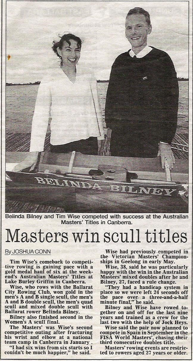Belinda Bilney continued her great job as secretary for a second year and continued to juggle work, training, competing nationally and internationally and still keep the club on an even keel. She and club Captain, Tim Wise also competed at the FISA World Master’s Regatta in Seville, Spain, in October winning the mixed A double scull for the third year in a row. They were the first and are still the only world Master’s champions in rowing from Ballarat. For the rest of the club it was again a very busy year with successes at state, National and International level. The hardworking committee was Colin Angow-President, Traci Robbins- treasurer and Tim Wise-Captain. Norm and Ron Young joined the committee this year and Kate Elliott, after a year’s leave of absence, also made a return as a committee member. A large number of junior rowers raced for valuable experience this season and, it was hoped, would go on to taste success next season. The club membership continued to grow with the number of social, recreational and masters rowers increasing. These members proved themselves invaluable in providing support and assistance in all areas of running the club. The number of wins was down somewhat on the previous season but many of our newer members joined the ranks of winners.