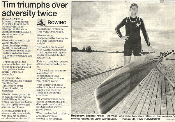 Tim Wise was our only Victorian Championship winner this year, overcoming illness to win the Victorian Champion Lightweight sculls for the fourth time. He became the only sculler to have his name on the Keith Bilney shield four times. He also raced with Al Isherwood to win the Champion Lightweight double sculls also.