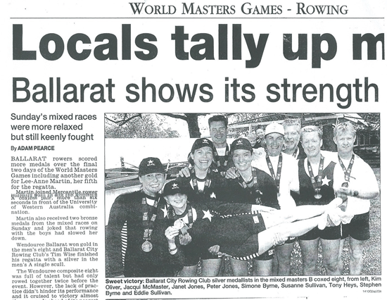 In October the biggest event since the 1956 Olympic Games was held on Lake Wendouree, the 2002 World Masters Games. While in ‘56 all that club members could have hoped to be involved in, was the organisation of the regatta or watching from the shore. This time the club competed proudly against the best Masters rowers in the world and brought back not only medals but great memories of a week of rowing that for most of us will be a once in a lifetime event. Twenty rowers from the club competed in events with the most successful being Tim Wise, who keeping his outstanding performance at this level over the past 6 years collected gold, silver and bronze in the single scull and double scull and again made a clean sweep of the mixed A and B double sculls with partner Belinda Bilney. The Mixed Masters B coxed eight was our last event with Janet Jones, Simone Byrne, Sue Sullivan, Kim Oliver, Steven Byrne, Eddie Sullivan, Peter Jones, Tony Heys and coxed by Jacquie McMaster, they showed true form to come home second and the reward of a Silver medal for the mantelpiece. Kate Elliott made a return to racing after seven years, in the Women’s C scull winning her heat and semi-final but could only managing 6th in the final.