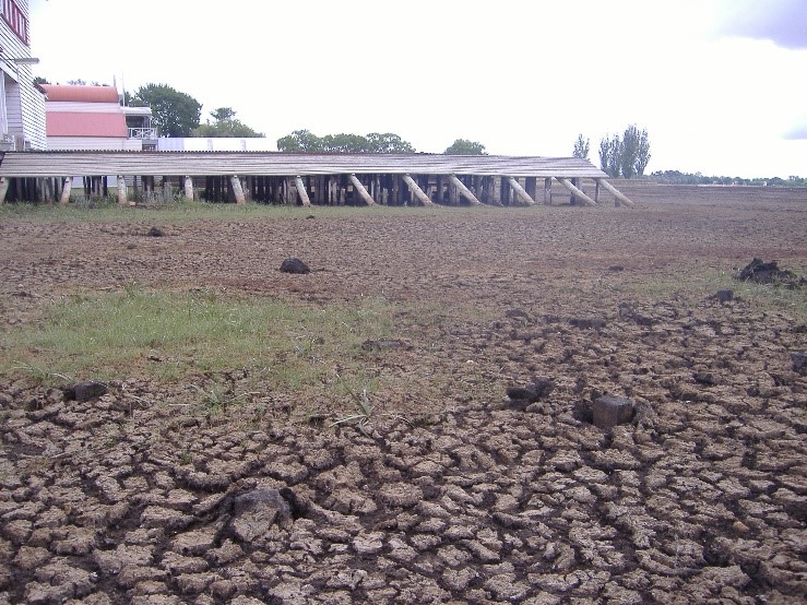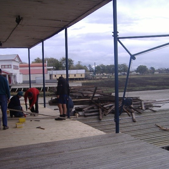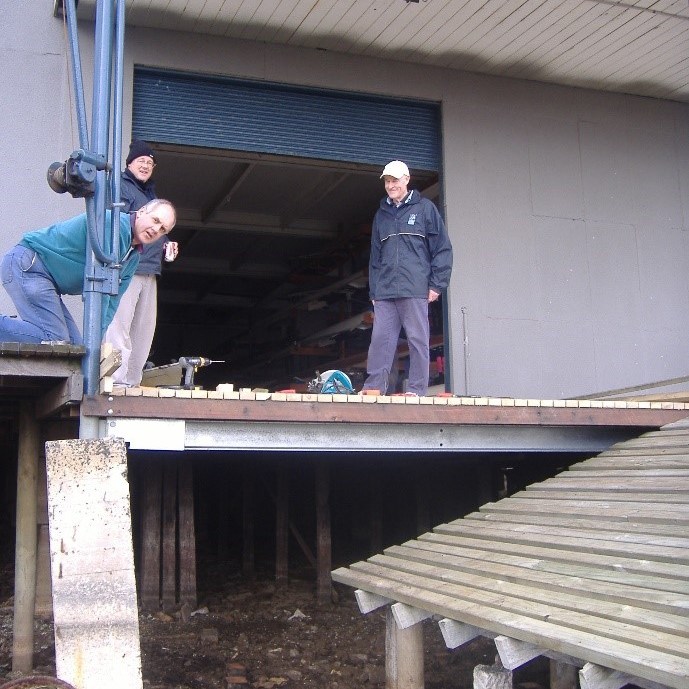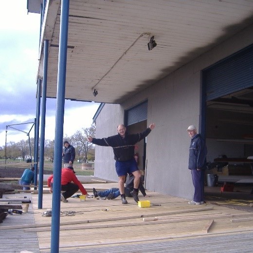 While this has obviously had a negative impact on the club in terms of training, racing and recruitment, there have also been some positives. The hardworking band of Master’s rowers, led by Wayne Lyle, Barry Lyle and Norm Young, have completed the re-decking and replacing of posts, joists and bearers of the jetty. The galvanized metal support structure made by Wayne and Barry to replace the decayed wooden structure, is a work of art and is made to last. If the shed was to fall down or be completely destroyed the only thing that would survive would be Wayne and Barry’s galvanized masterpiece. This also tied the jetty back to the steel structure of the shed which wasn’t done when the shed was built in 1956. Consequently with the lake bed drying out and the concrete piers shifting the balcony, which rested on the jetty only, was threatening to pull away from the shed. Wayne and Barry’s very timely engineering averted this disaster. The jetty has never looked so good or been so structurally sound. Much work was also put in reinforcing and renovating the concrete piers under the shed. Many old posts that were no longer supporting anything were removed by Jeff Hooper. It is worth mentioning because it was just a big a task but before we could replace the decking, first we had to pull it all up, and there was a lot to pull up. Then we had to work out how to dispose of it and so many ute loads were taken away. Much of the wood was not salvageable and it was also full of nails so it was a tricky job pulling it up, stacking it, then loading it and taking it away!