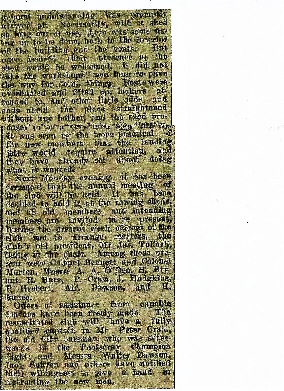 “A band of earnest workers made the shed safe and habitable. Messrs. W. Nankervis, J. Frees, G. Eaton, J. Hazelgrove, J. Hodges, Lethborg and club Captain P. Cram gave the old shed a thorough overhaul in their spare time.