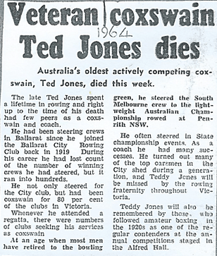 EDWARD (TEDDY) JONES Ballarat City Rowing Club-Life Member, Vice-President, Committee member, BRA delegate, BCRC Selection Committee, coach, coxswain extraordinaire for over 40 years.