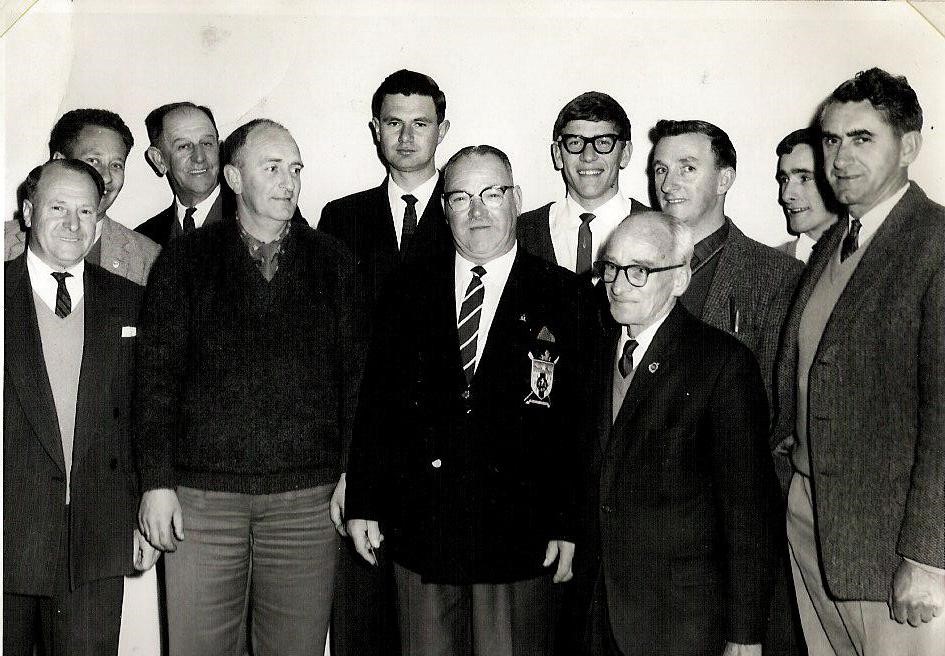 Annual meeting BCRC 1964.Left to right front row Jack Costa, Alf Quick, President- Frank Findlay and Teddy Edwards. Back row: Ralph Murphy, Otto Hauser, Alan Dixon, Bob Coutts, Bob Lawrie, Daryl Brown, Bill Sadler