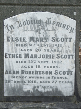 Corporal A.W.Mitchell of the 2nd Anzac Regiment made the following statement about how he died, to the Red Cross:-“On the 28th of April we went into line and well to the right of Ridgewood near Dickebusch-dug in about 1000 yards from the firing line(we had dug in the night before).Enemy put over a barrage-one of our own Howitzer shells fell short, splinter of which hit him (Scott) in the side of the head-was unconscious for 3 hours-I was 3 yards away from him. Never came to. Taken to Casualty Clearing Station and died the same night. Don’t know where buried but expect outside Casualty Clearing Station.-Scott was a Sergeant and a fine, cool soldier-came from Ballarat-Christian name Alan.”