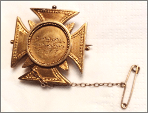 Geelong Advertiser 5 March 1885 also stated that “The president of the South Barwon Shire Council (Mr. W Higgins) was so delighted with the contest for this event that he at once decided to give the Williamstown crew a prize equal in value to that won by the Ballarat City club. Walter Higgins was a solicitor in Yarra Street Geelong, and pictured is the gold Maltese cross presented to Williamstown oarsman H.Currie who was bowman in that crew.The Williamstown crew were A. White (stroke), M.Hackett (7),E.Morriner (6), W.Wood (5), C. Currie (4),T.Bell (3),W.Ogden (2) and H.Currie (bow). The coxswain was A. Jones.